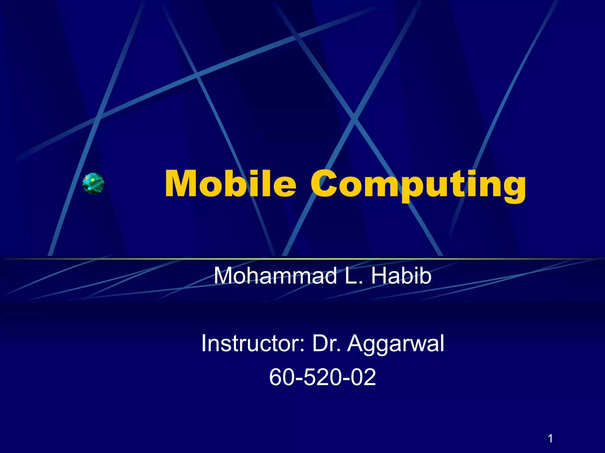 The document discusses mobile computing, which allows users with portable devices to access network services anytime and anywhere. It compares mobile networks to wired networks, highlighting the advantages of mobility, numerous wireless devices, and the concept of mobile objects that change state and location. The presentation also addresses challenges in mobile computing, future developments, and applications in various fields such as emergency services and transportation.