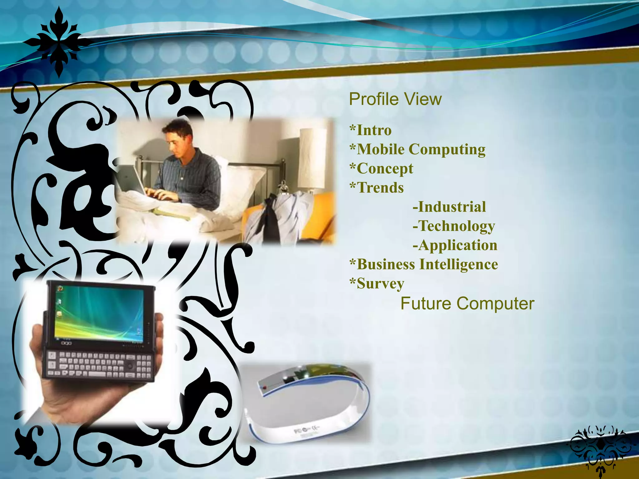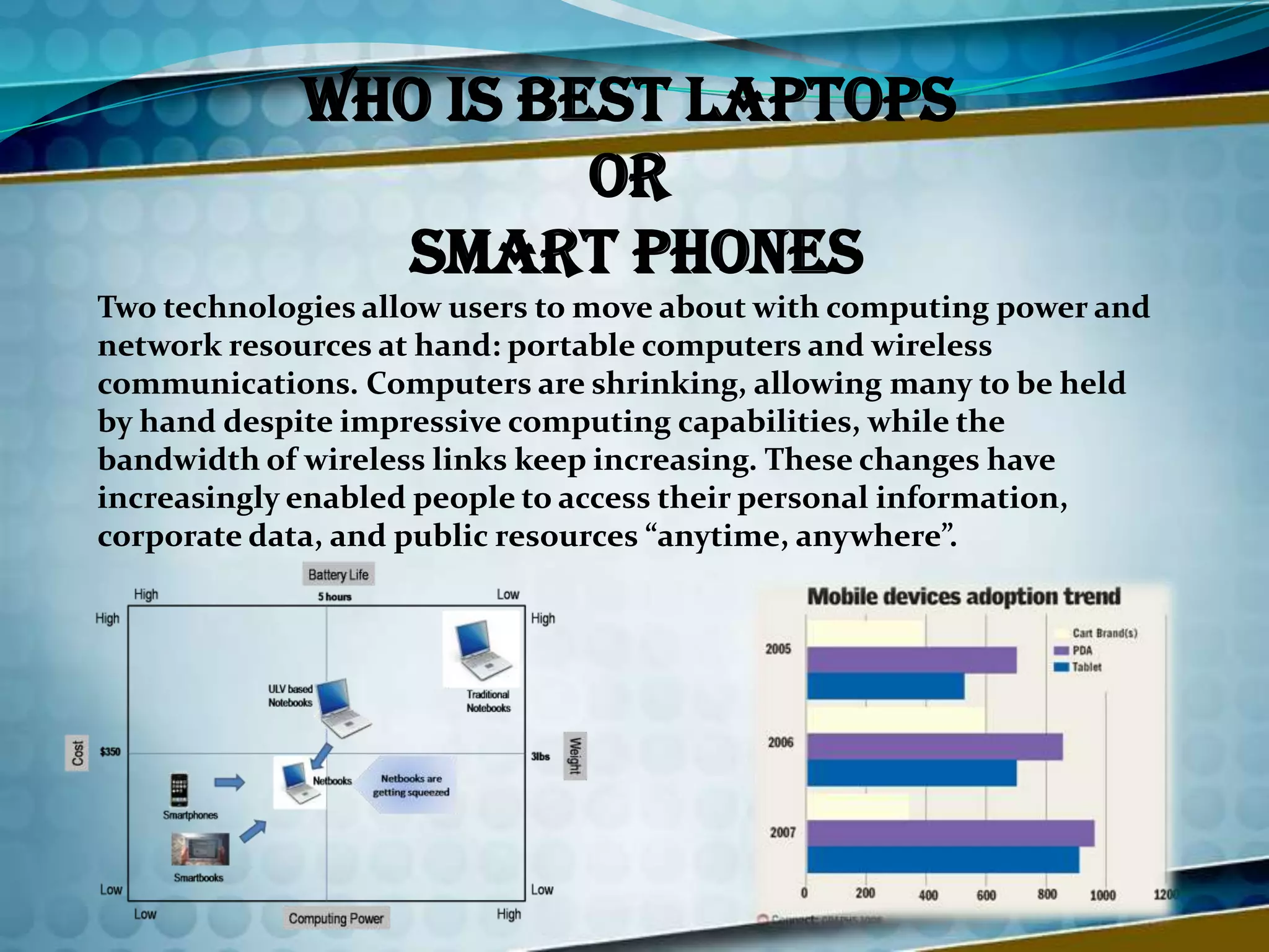 Mobile computing allows users to access information and computing resources while mobile through portable devices and wireless connectivity. It began in the 1980s with laptop computers and has advanced significantly with improvements in battery life, size and wireless technologies. Current trends include business intelligence applications and the increasing capabilities and compatibility of both smartphones and laptops to enable work from any location. Future research opportunities remain in developing improved protocols and algorithms to better manage data and transactions across mobile networks.