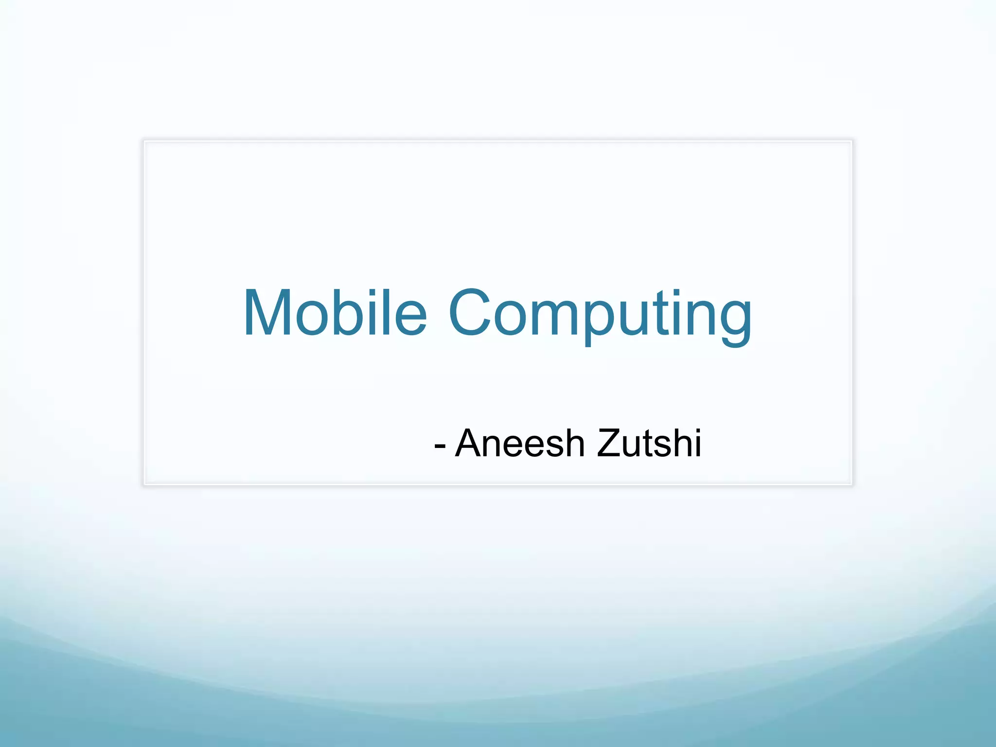 The document discusses mobile computing, describing the components of mobile devices including CPUs, storage, wireless connectivity, and mobile operating systems. It also covers types of mobile applications such as native apps and browser-based apps, considerations for developing mobile apps, and examples of popular mobile apps including Spotify, Foursquare, Instagram, and check-in rewards apps. Mobile apps offer opportunities for economic growth by providing services that desktop software cannot through the mobility and connectivity of smartphones.