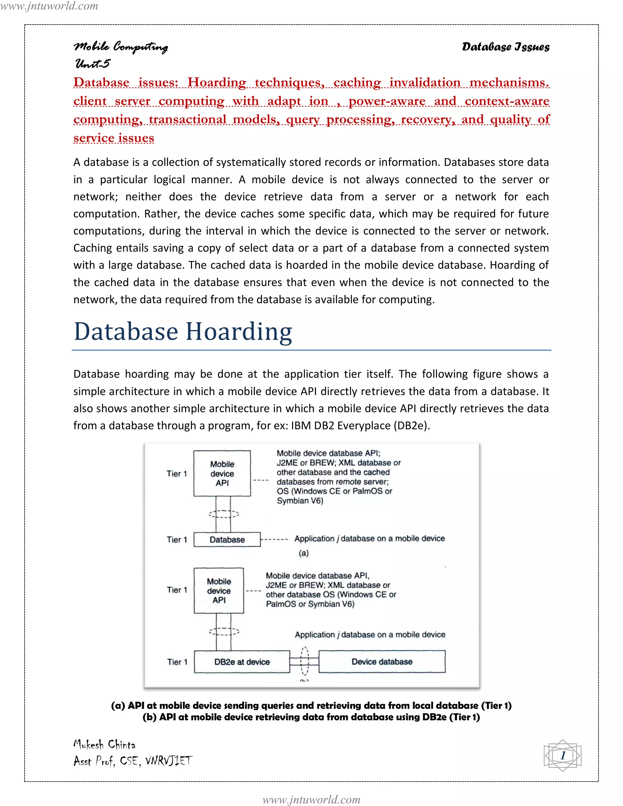 The document discusses database issues related to mobile computing. It describes how mobile devices cache data from servers to reduce latency when the device is offline. The cached data is referred to as being "hoarded" in the device database. It discusses different database architectures including one-tier architectures where the database is specific to a mobile device and two-tier architectures involving client-server models. It also describes different cache invalidation mechanisms used to maintain consistency between cached data on devices and data on servers.