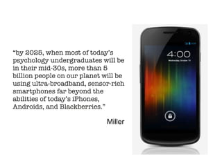 (1) Mobile devices can now collect vast amounts of contextual data through sensors and user inputs. This data has potential to support applications in recommender systems, social psychology research, and transport information systems.