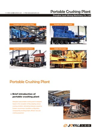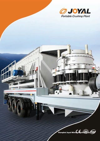 Shanghai Joyal Mining Machinery Co., Ltd produces portable crushing plants that can be transported by truck and quickly assembled on site. Their portable plants include jaw, cone, and impact crushers as well as vibrating screens and conveyor belts mounted on a single chassis. The portable design allows crushing to occur near quarries and worksites, reducing material transportation costs.