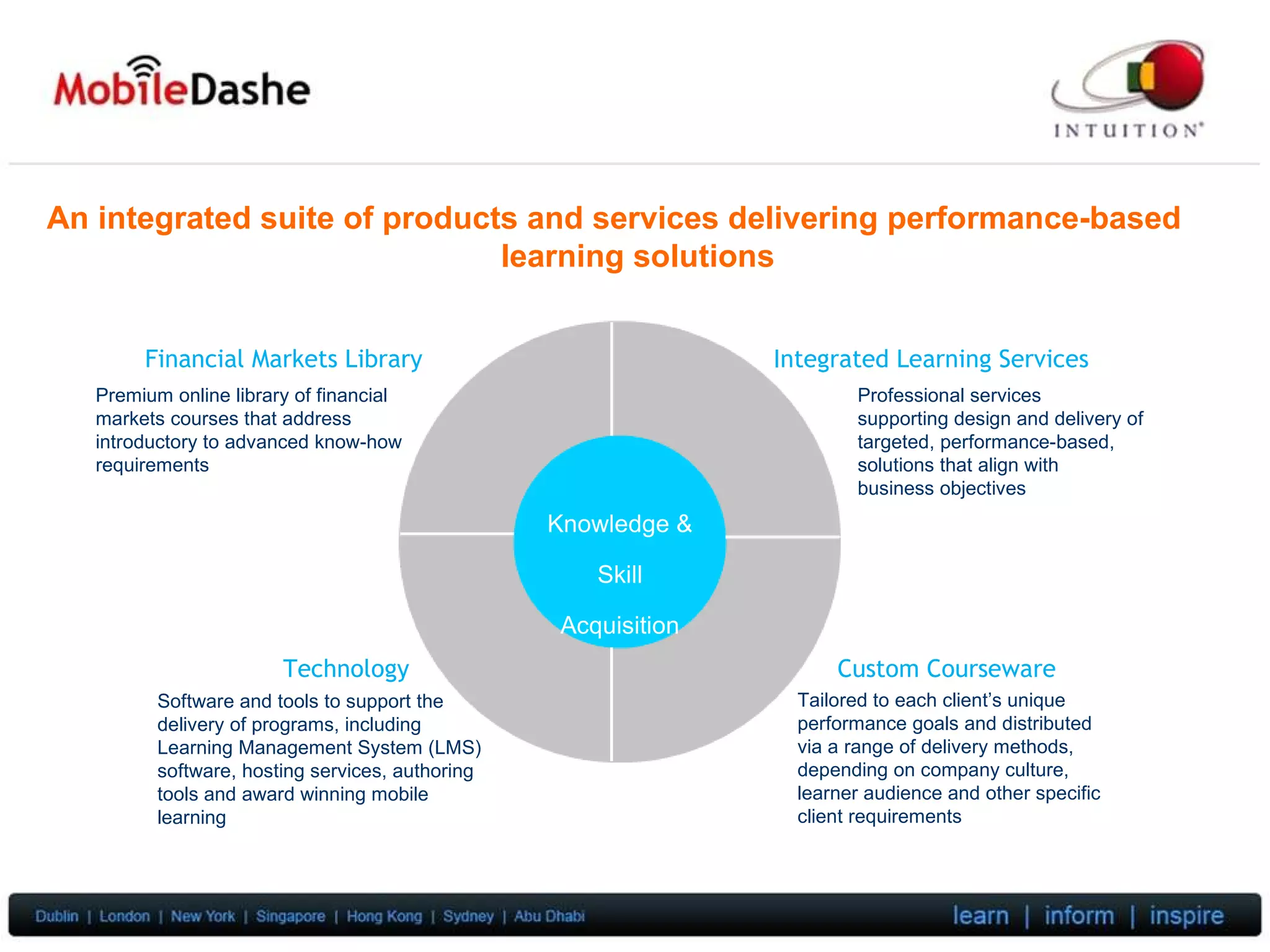 2) A case study highlights how Merrill Lynch used the solution to deliver mandatory compliance courses to over 2,100 BlackBerry devices, resulting in higher test scores, less time spent, and earlier completion of training requirements.
