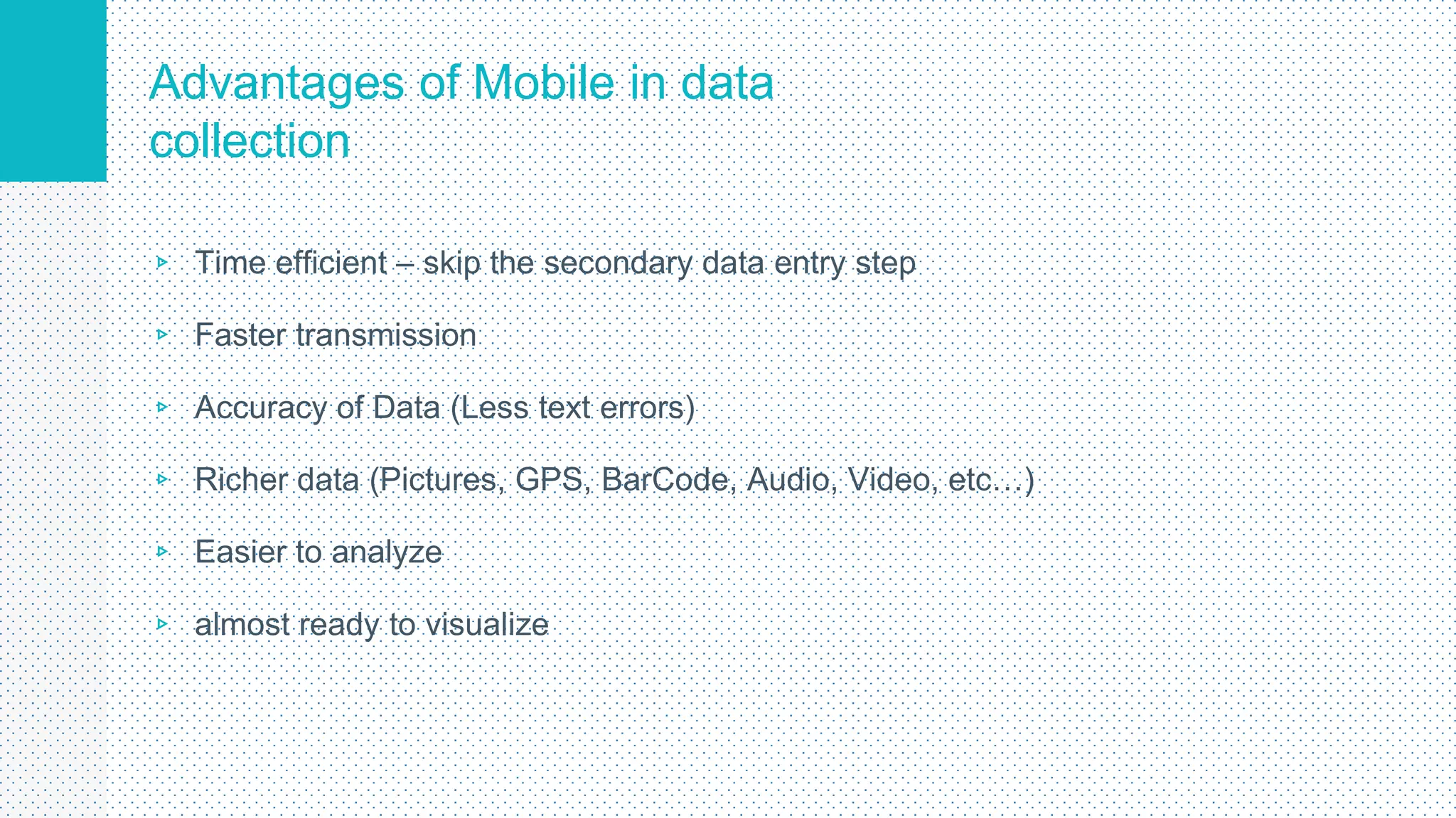 This document discusses mobile data collection and visualization tools. It begins by outlining advantages of mobile data collection like time efficiency and richer data. Challenges like initial trainings and device provisioning are also covered. Popular free and open source tools for data collection are introduced, including Google Forms, Survey Monkey, Formhub and Open Data Kit (ODK). ODK is recommended due to its capabilities and because it is free for unlimited data sets. The components of ODK like Build, Collect and Aggregate are described. Steps for data cleaning and visualization are outlined. Finally, visualization tools like Tableau, R and Infogram are mentioned.
