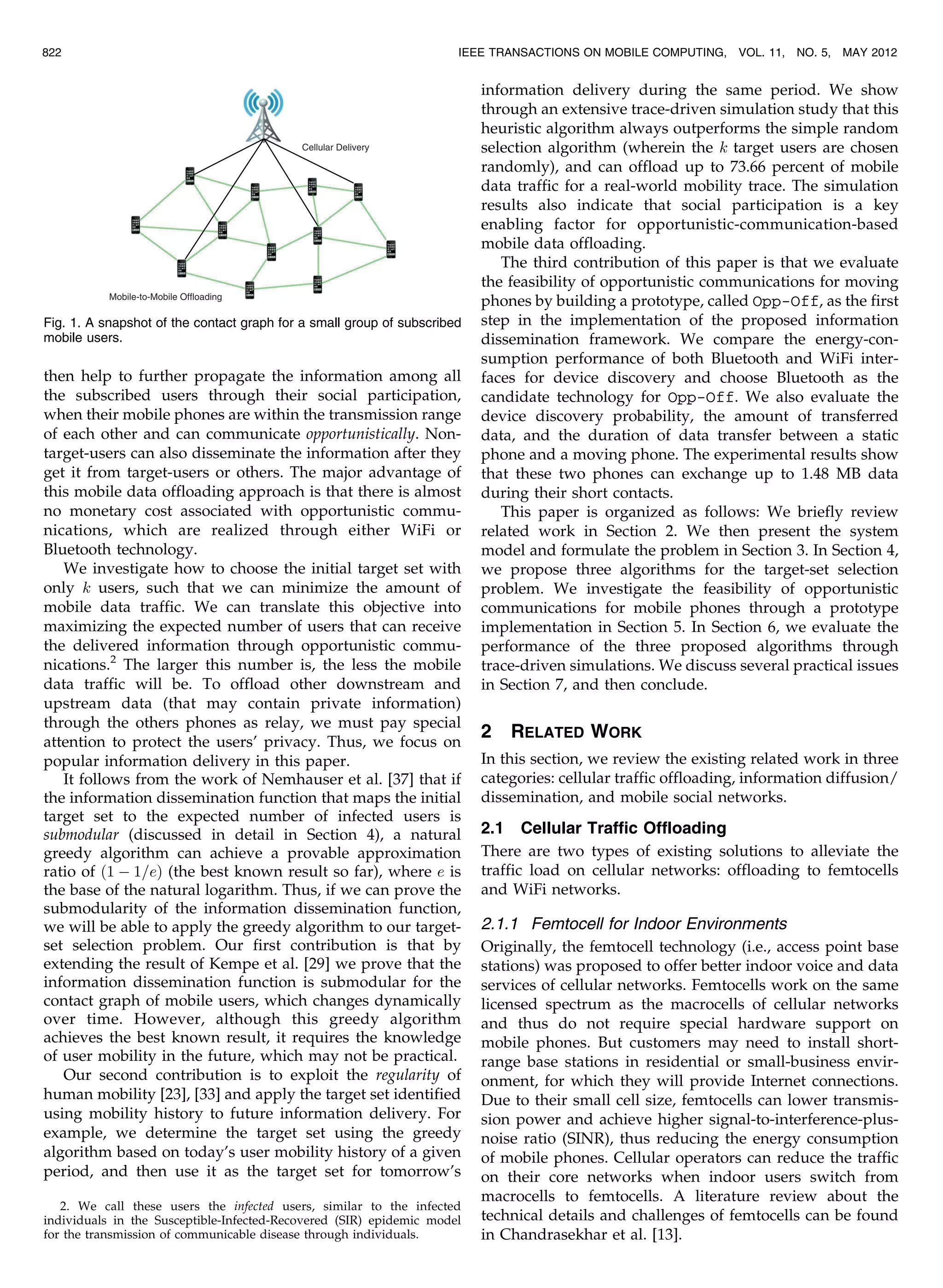 The document discusses mobile data offloading to address the overload of 3G networks due to increased smartphone usage. It proposes using opportunistic communications within mobile social networks to disseminate information and reduce cellular data traffic, with three algorithms developed for target-set selection. Results indicate that a heuristic algorithm can offload up to 73.66% of mobile data traffic, demonstrating the effectiveness of social participation in information dissemination.
