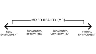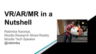 This document provides an overview of VR, AR and MR technologies and the A-Frame framework for building VR experiences. It discusses that VR immerses the user in a simulated environment, AR overlays digital content on the real world, and MR combines both. Key factors that have enabled growth in these areas are improved smartphone cameras and processing power. The document outlines important input sensors, processing techniques like SLAM, graphics APIs, and frameworks like A-Frame that can be used to build VR/AR/MR applications. It encourages experimenting with new opportunities in this emerging field.