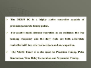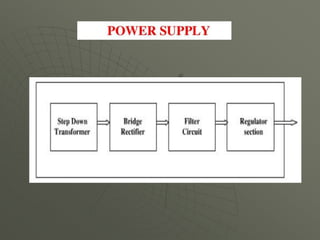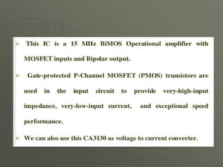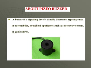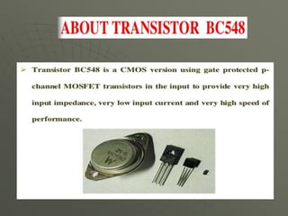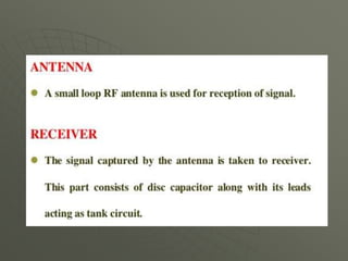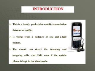 This document presents a mobile detector circuit that uses a capacitor to detect radio frequency (RF) signals from mobile phones. It includes a block diagram and circuit diagram. The circuit works by using a capacitor as a mini loop antenna to absorb energy from nearby mobile phone signals. This causes the capacitor to oscillate and release a current that unbalances the inputs of the integrated circuit, triggering the LED and buzzer to indicate detection. The document discusses the working principle and components used, including capacitors, transistors, LEDs, buzzers, and integrated circuits. It also covers applications and limitations of the prototype circuit.