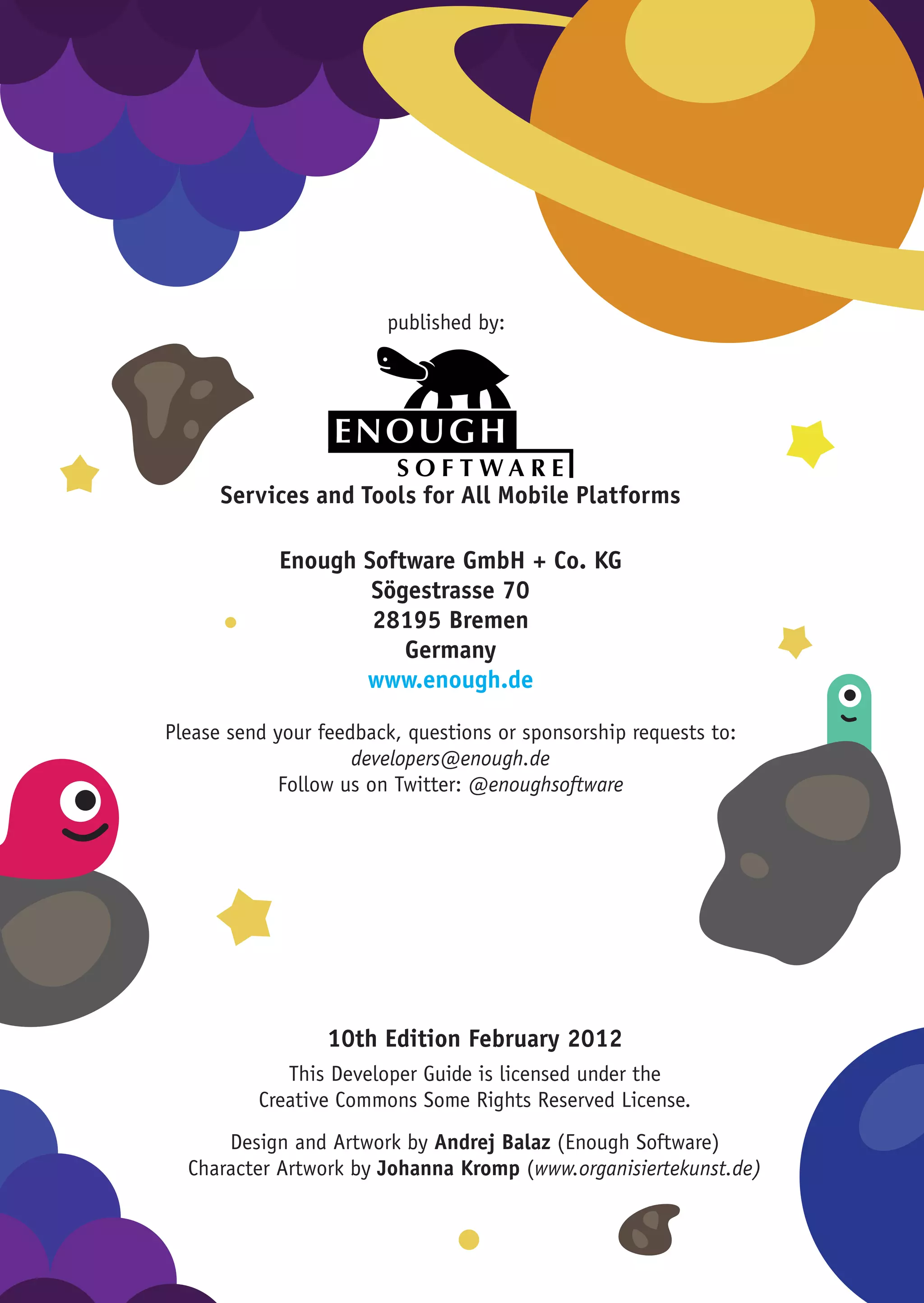 The document is the 10th edition of a mobile developer's guide published by Enough Software, detailing various application platforms and programming frameworks for mobile development. It covers native applications, web apps, and provides insights into platforms like Android, iOS, Windows Phone, and cross-platform tools. The guide also addresses important topics such as security, monetization, and accessibility in mobile app development, and acknowledges contributions from the community.