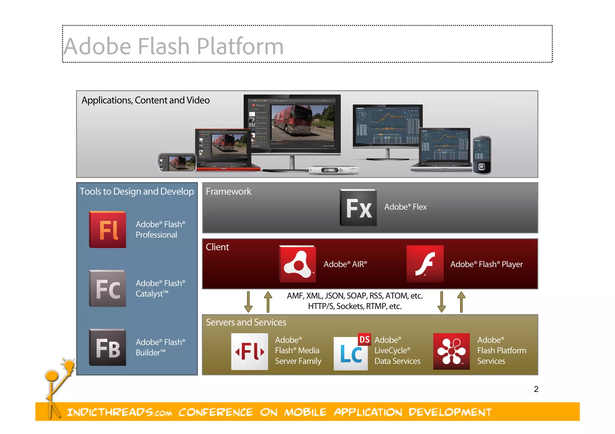 This document outlines the Adobe Flash Platform for mobile development, emphasizing its tools and functionalities across various platforms. It covers user interface design principles, device capabilities, and techniques for creating flexible layouts, alongside considerations for performance optimization. Additionally, it provides resources and tips for effective coding and testing in Adobe Flex and Flash Builder.