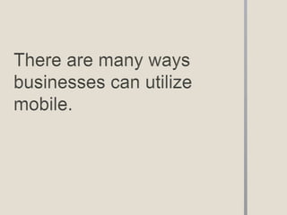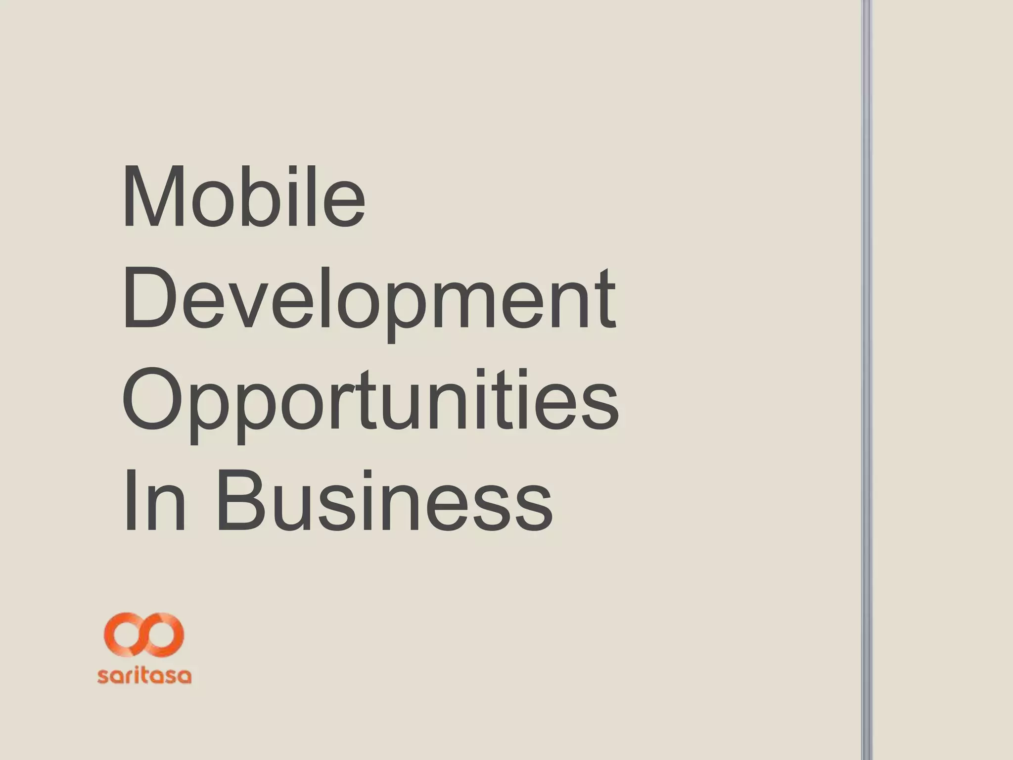 The document discusses the significant impact of mobile development on business, highlighting its use in sales, marketing, and employee training. It notes that mobile technologies are prevalent among Fortune 500 companies and have created new opportunities for better engagement and communication. Companies are encouraged to tailor mobile solutions to their specific goals and user needs for optimal results.