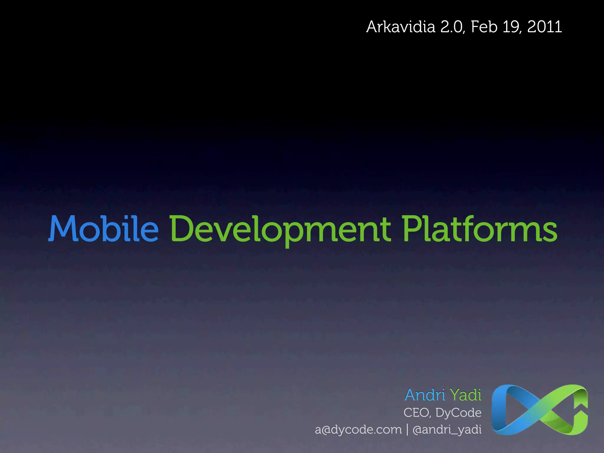 The document discusses various mobile development platforms as of February 2011, highlighting the market share of different operating systems such as Android, iOS, and Windows Phone. It provides an overview of the development tools and SDKs available for each platform, as well as statistics on app availability and downloads. The document emphasizes the importance of user experience and suggests strategies for indie developers to succeed in the competitive mobile market.