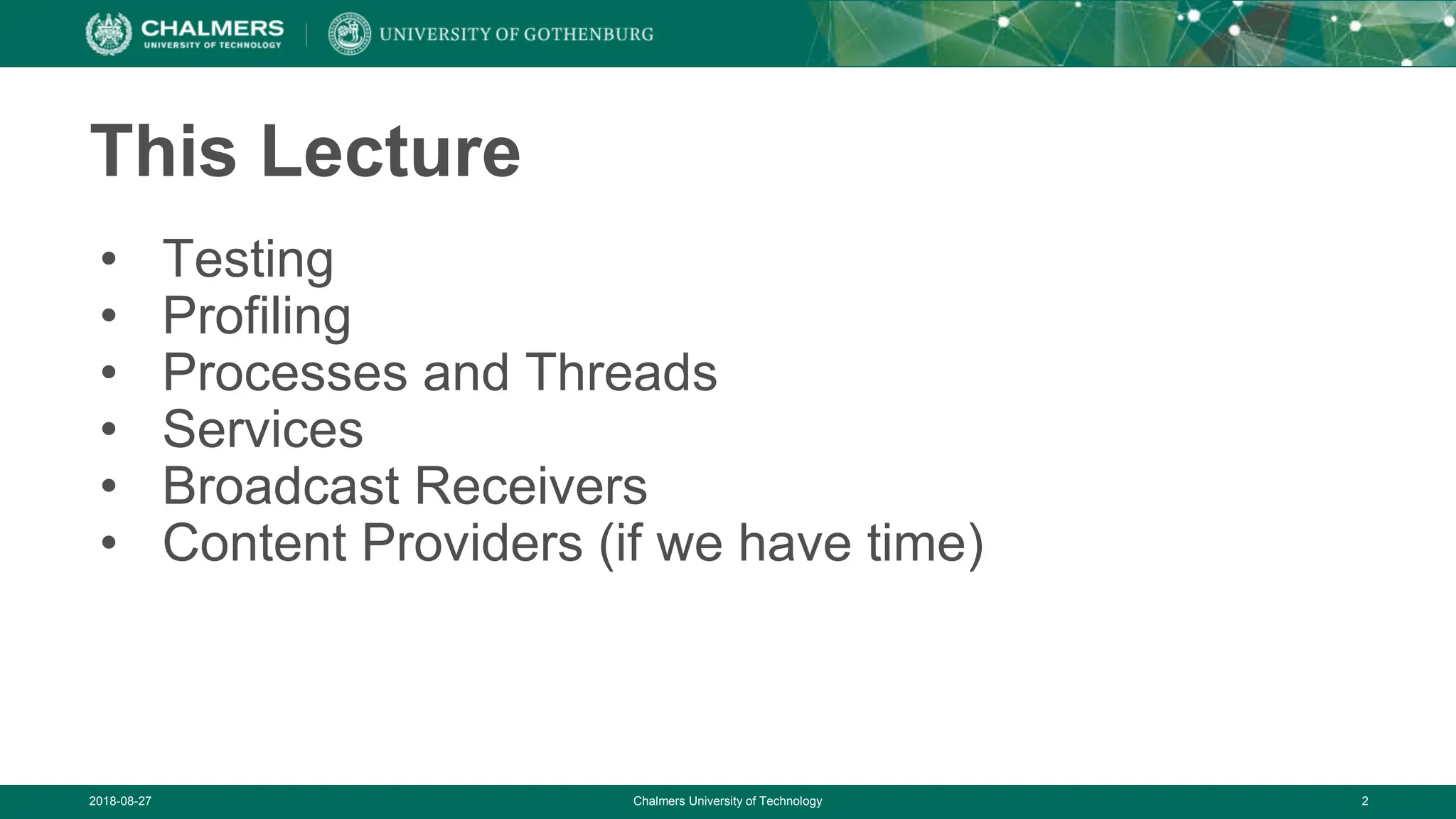 This lecture covers mobile development with Android, including testing, profiling, processes and threads, services, broadcast receivers, and content providers. It discusses the importance of testing at the unit, integration, and UI levels. It also describes how to perform unit testing, UI testing, smoke testing, canary testing, and monkey testing. The lecture explains the differences between processes and threads in Android and how to specify code for a background thread. It discusses various ways to handle background tasks like services, WorkManager, AlarmManager, and DownloadManager. The lecture covers the basics of services, bound services, and IntentServices. It also explains broadcast receivers, how to register them, and best practices for sending broadcasts. Finally, it provides an overview