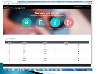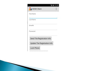 Mobile Device Management (MDM) software allows companies to secure, manage, and monitor mobile devices used by employees. The MDM software installs an admin app on company-owned devices, allowing IT administrators to obtain mobile data, control app installation and updates, remotely lock or wipe devices, and enforce company policies. The MDM system includes an Android/iOS app, server software with REST APIs, and an admin web console to control and analyze device usage from a central dashboard. MDM provides security, analytics, and remote management capabilities to enterprises at different subscription levels.