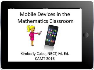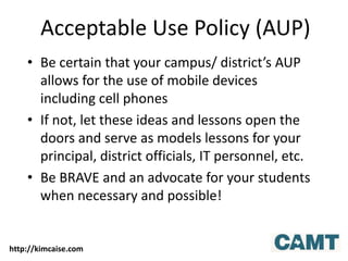 The document discusses the use of mobile devices in mathematics classrooms and emphasizes the importance of ensuring compliance with the campus's acceptable use policy. It presents various tools and applications like Mentimeter, Cel.ly, Animoto, and others that can enhance student engagement and learning through interactive and multimedia content. Additionally, it provides resources and links for teachers to implement these tools effectively in their teaching practices.