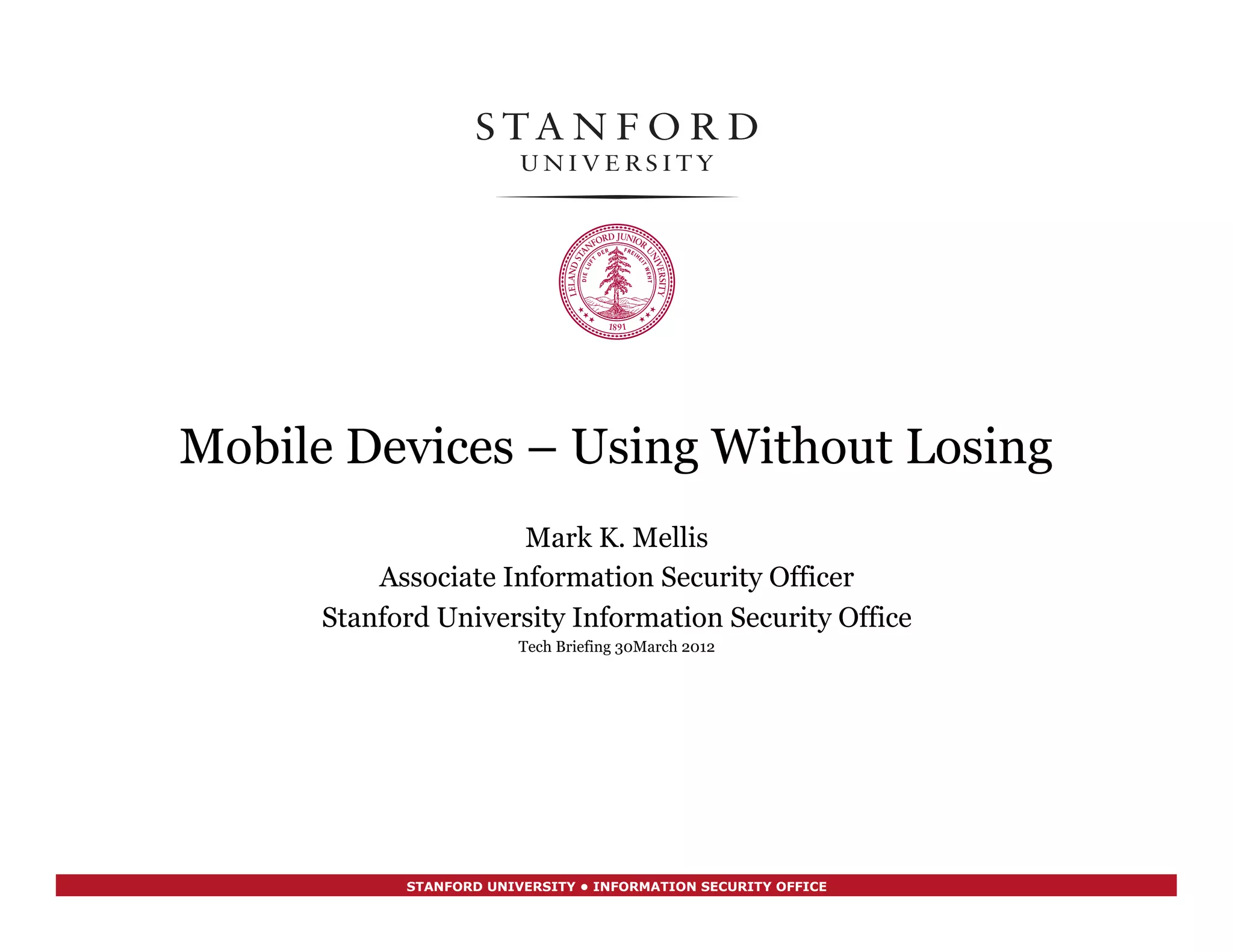 Mark K. Mellis of Stanford University's Information Security Office gave a briefing on securing mobile devices. He discussed risks of loss, theft, or spying of mobile devices and tips for using passcodes, updating software, backups, and encryption. If a device is lost or stolen, he recommends immediately changing network passwords and potentially wiping the device remotely if it is enrolled in Stanford's Mobile Device Management program.