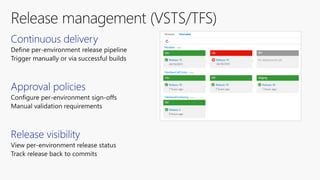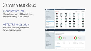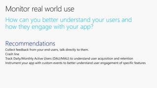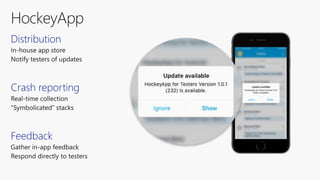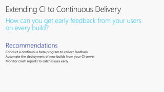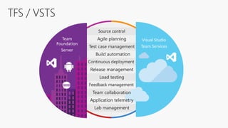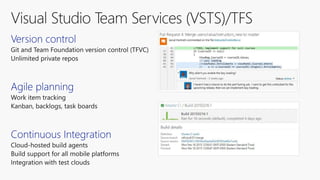 The document discusses automating the mobile app lifecycle using Visual Studio and Team Foundation Server to enhance quality and speed in development. It emphasizes the importance of user feedback, app telemetry, and various tools for continuous delivery. Overall, it aims to help developers deliver high-quality apps efficiently across multiple platforms.