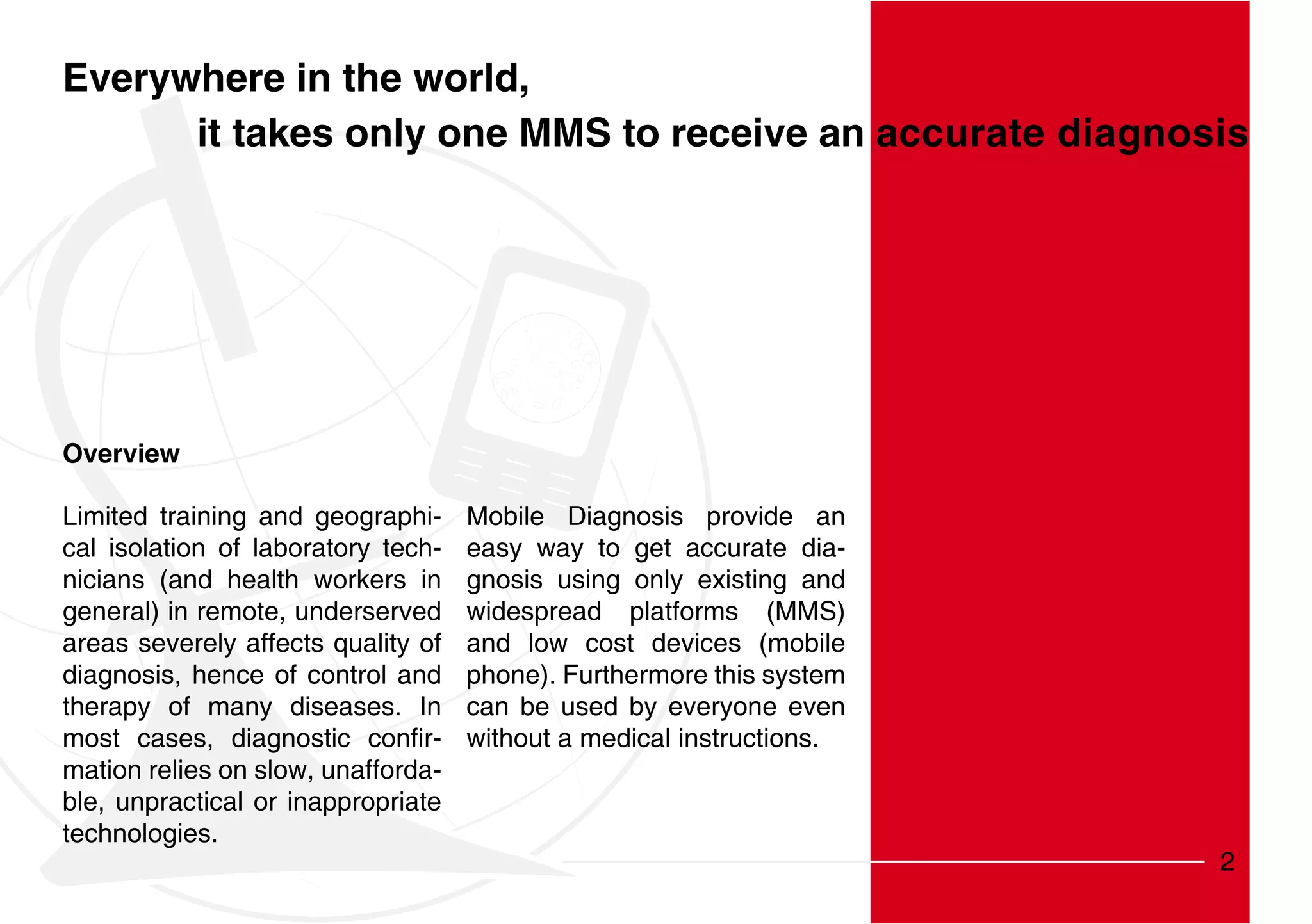 Mobile Diagnosis provides an easy way for health workers worldwide to obtain accurate diagnoses using existing mobile phone platforms and microscopy. By taking pictures through a microscope with a mobile phone and sending them via MMS, health workers in remote areas can receive diagnoses for difficult cases from experts elsewhere. The method has been used successfully in projects in countries like Uganda, Bangladesh, Afghanistan, and Madagascar to improve access to healthcare in rural communities. It allows for education, monitoring of disease spread, and decreased costs compared to other technologies.