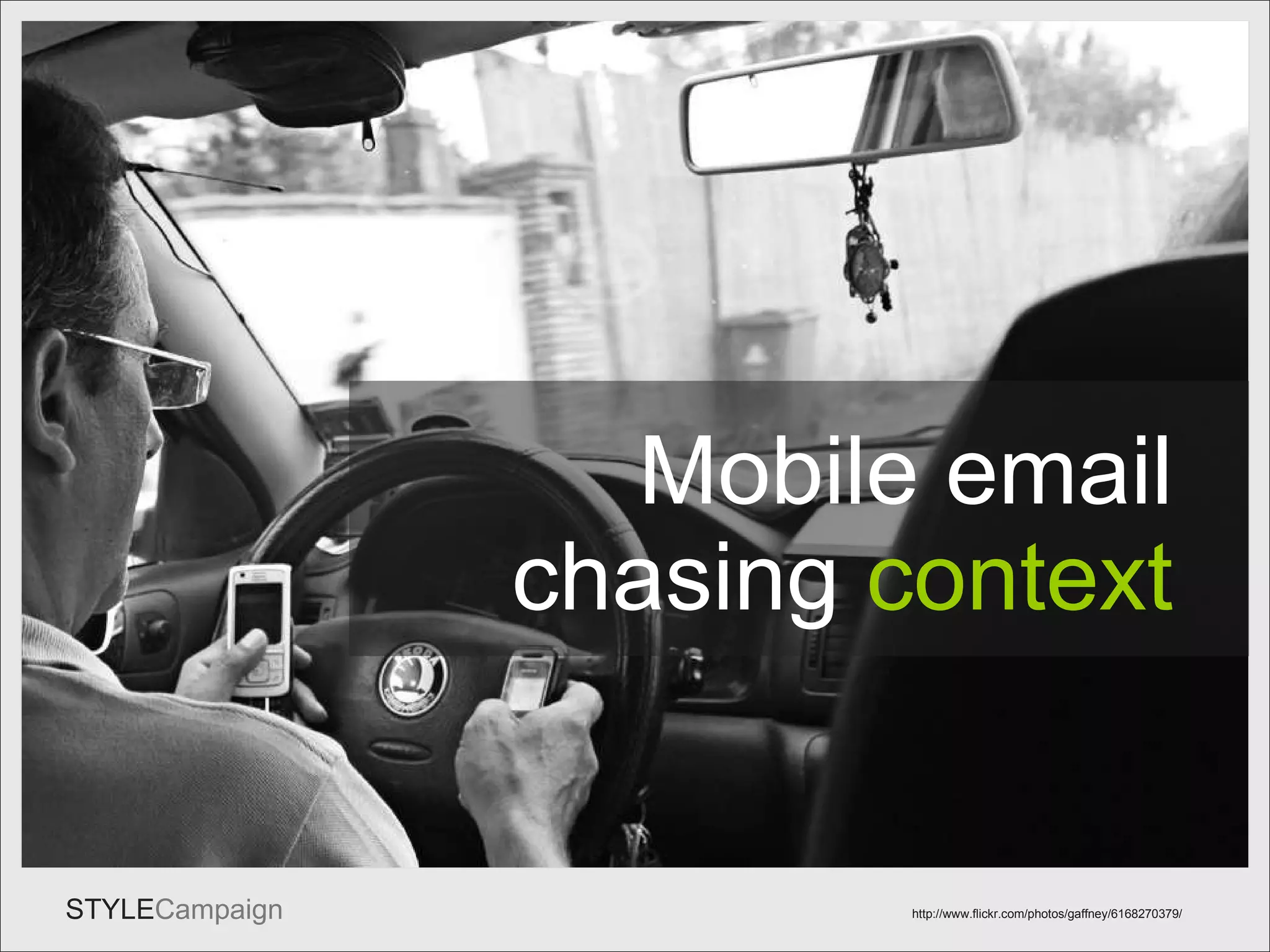 The document discusses mobile email usage trends, highlighting that peak mobile email usage occurs at 7 AM and peaks again at 11 PM, particularly among younger adults who often sleep with their phones. It emphasizes the importance of device-optimized design and user context, suggesting that mobile emails should be simple, easy to read, and accessible to cater to users' needs while on the go. Additionally, it addresses the significance of performance, layout adjustments, and usability features like larger touch targets for better interaction on mobile devices.