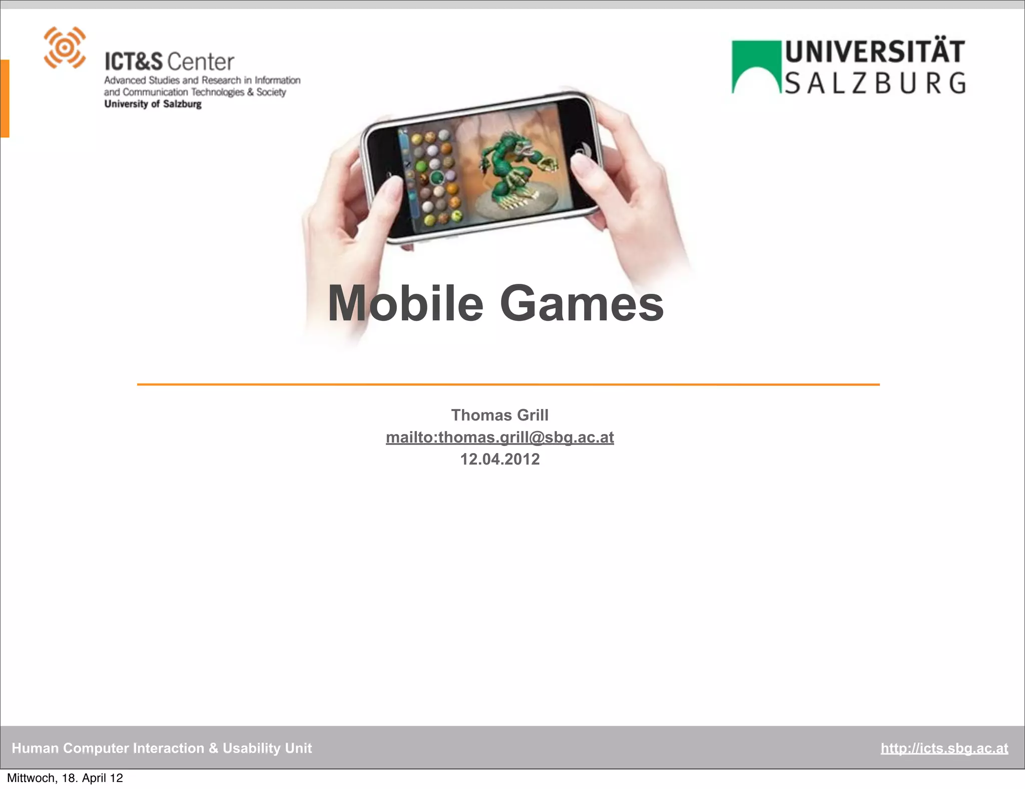 The document outlines a course on mobile games, covering their design, development, and characteristics. It includes topics such as game concepts, interaction methods, balancing gameplay, and design patterns that inform the creation of mobile gaming experiences. Key components such as game genres, platforms, and the constraints of mobile devices are also discussed.