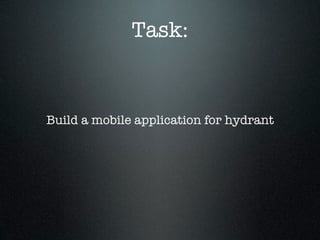 This document discusses building a mobile application for hydrants using a browser-based approach. It outlines key challenges like geolocation, user persistence without device dependence, and handling offline usage. The document provides code examples for geolocation, local storage, and detecting online status to gracefully handle loss of connectivity. It recommends making the web app feel like a native mobile application through features like home screen icons.