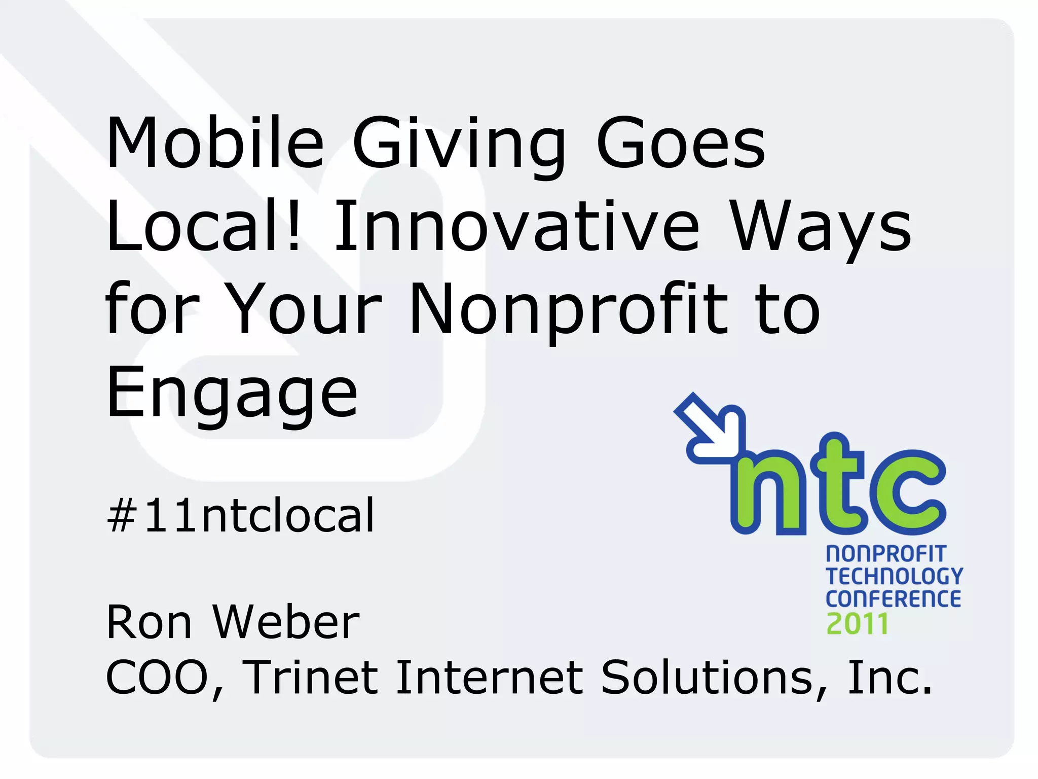 The document discusses innovative ways for nonprofits to engage supporters using mobile technologies like location-based services. It provides examples of how nonprofits have used check-ins on services like Foursquare to raise funds and awareness. The presentation outlines how location-based apps can help nonprofits build local communities and connect with supporters in their area through relevant content and promotions. It also offers steps for nonprofits to get started with location-based fundraising.