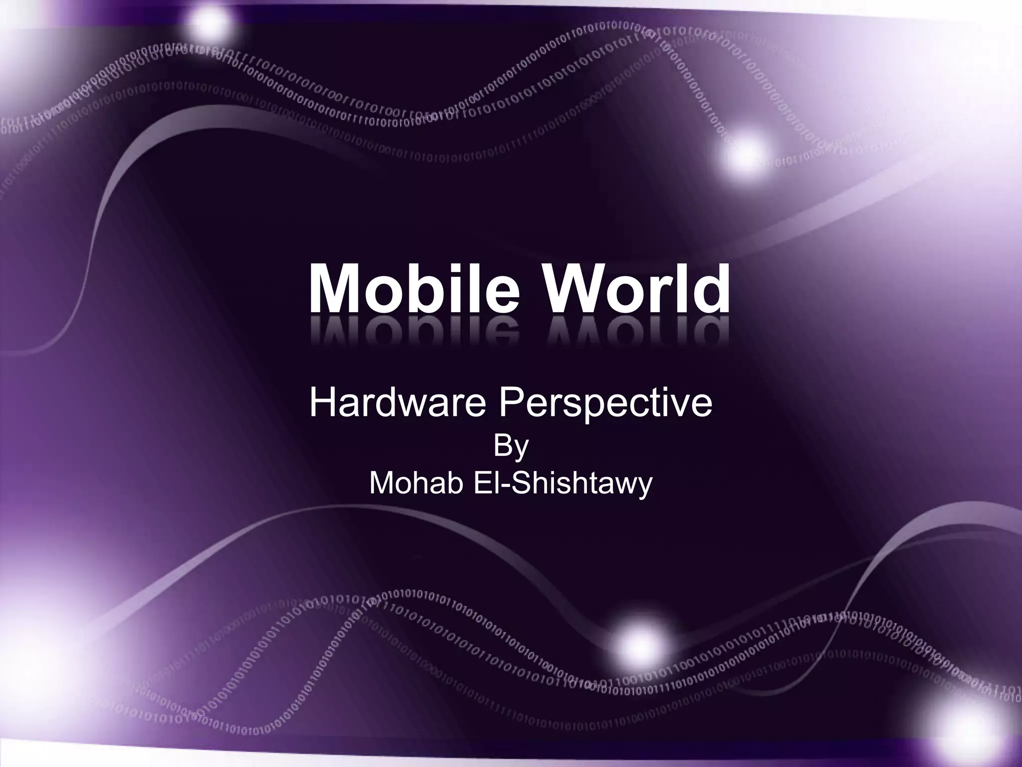 This document discusses the hardware components and connectivity features of mobile devices from different perspectives. It begins by explaining why studying hardware is important for engineers and app developers. It then provides details about basic hardware components like touch screens, processors, memory, and sensors. It describes different types of touch screens, processors like SoCs, RAM and storage. It also covers connectivity aspects such as mobile networks, Bluetooth, USB, and integrated sensors. The document aims to educate about the internal components of mobile devices and how understanding them can help create better applications and maximize the capabilities of smartphones.