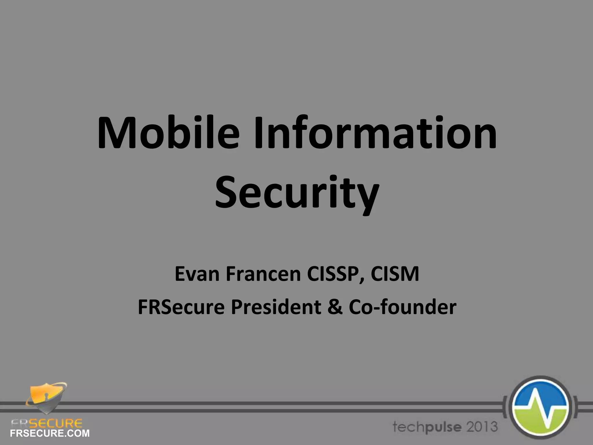 Frsecure, founded in 2008 by experts in information security, emphasizes the importance of mobile device management and encryption to prevent data breaches. They discuss the risks associated with personal mobile device usage and provide an example of a significant data breach that resulted from poor security practices. The document advocates for comprehensive policies, employee training, and a risk-based approach to enhance organizational security.