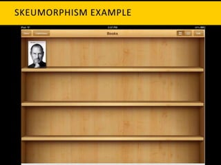 Patterns are solutions to common design problems that provide an ideal starting point for newcomers to design and an excellent reference for experienced designers. Some common patterns include trading cards, palettes, hub and spoke, bento boxes, search, and conversational. Patterns are used for things like content views, settings, canvas and palettes for content creation, category and detail views, elements with hot spots, and search boxes. Considerations for using patterns effectively include ensuring information is easy to grasp, focusing on content over chrome, avoiding information overload, and keeping users informed without being wordy.