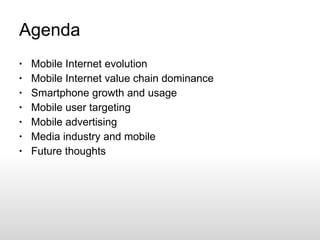 The document outlines the evolution of mobile internet from simple text-based services to today's complex systems featuring smartphones and app-based interactions. It discusses the value chain of mobile internet, the rise of mobile advertising, and the challenges faced by media industries as they transition from traditional models to digital and mobile platforms. The document highlights the need for content relevance in mobile advertising and emphasizes the importance of integrating mobile strategies into marketing mixes.