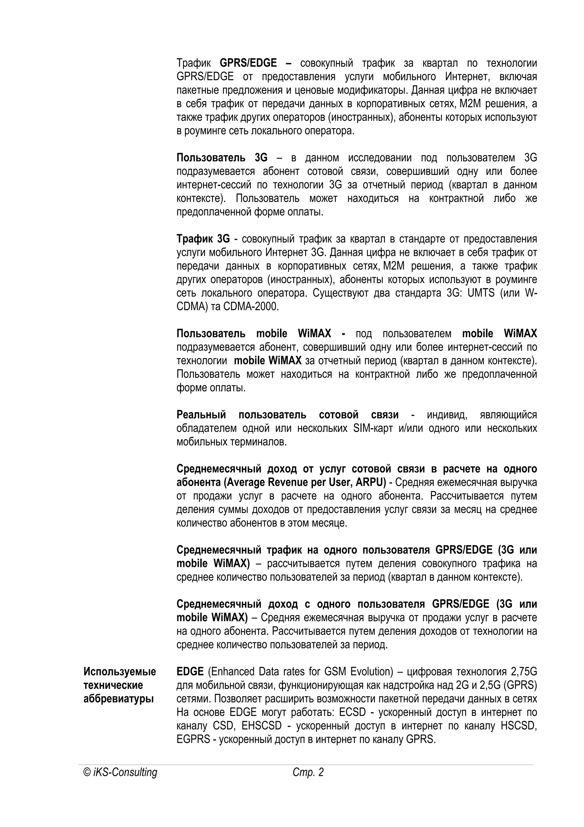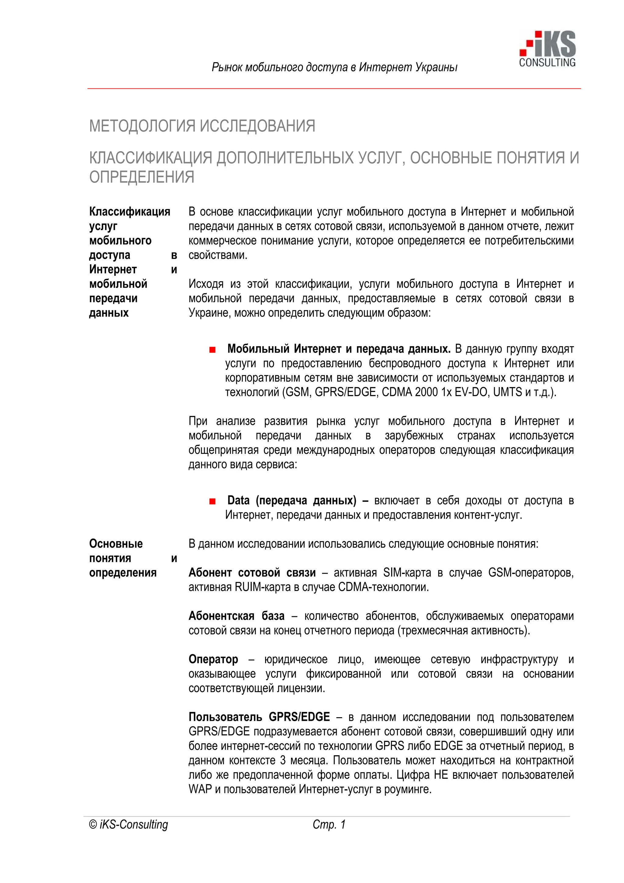 Документ описывает методологию исследования рынка мобильного доступа к интернету в Украине, включая классификацию услуг и основные понятия. В нем рассматриваются определения абонентов, операторов, пользовательских сессий и трафика по различным технологиям связи, таким как 3G и GPRS/EDGE. Также представлены ключевые метрики, такие как среднемесячный доход на пользователя и трафик, что позволяет проанализировать развитие данного рынка.