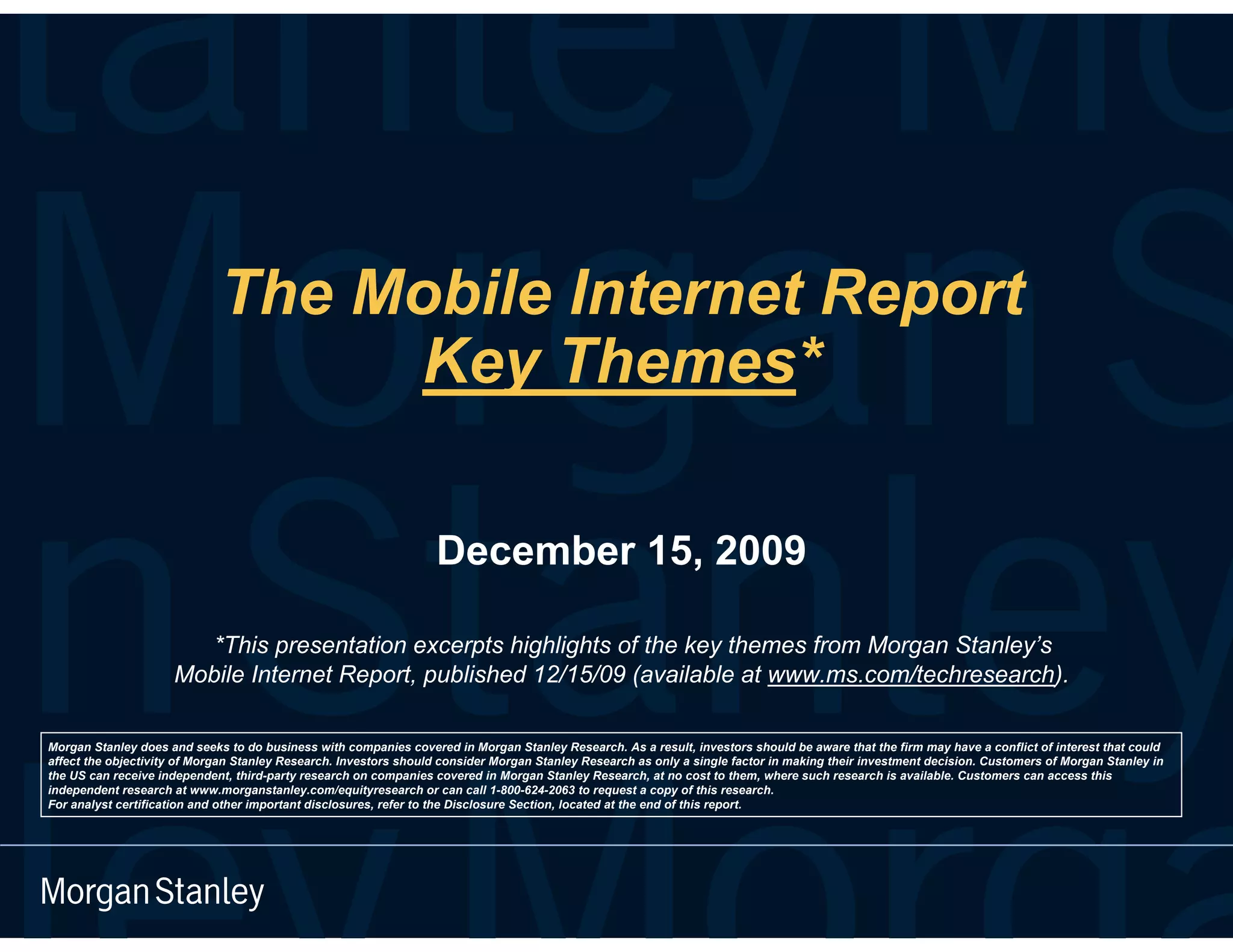 The document summarizes key themes from Morgan Stanley's Mobile Internet Report. The first theme is that wealth creation and destruction is material during new computing cycles, and we are currently in the early innings of the mobile internet cycle. History shows that massive technology changes typically shift dynamics between incumbents and attackers, creating winners and losers. A handful of current incumbents like Apple, Google, Amazon and Skype appear well positioned for the mobile changes.