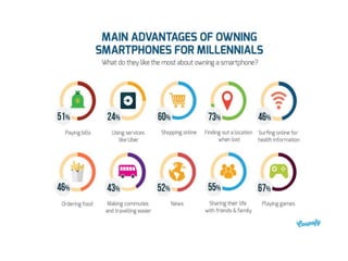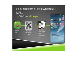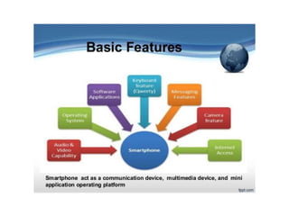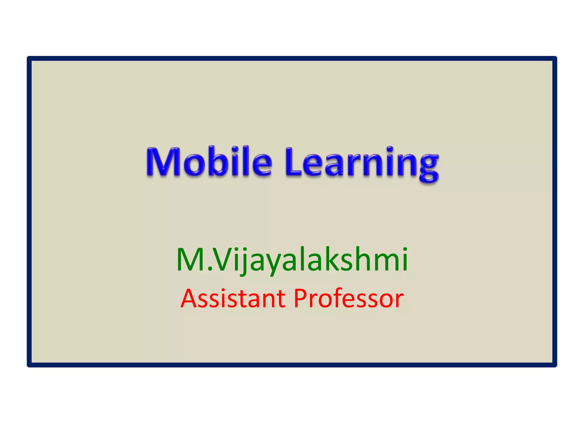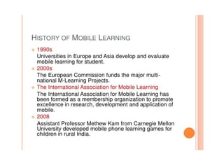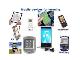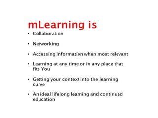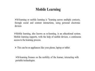 Mobile learning (m-learning) involves using mobile technologies and devices like smartphones and tablets to access educational content. Smartphones allow learning materials to be accessed anywhere and support activities like conducting research, taking notes, communicating with others, and accessing multimedia resources. In schools, colleges and universities, smartphones help with tasks like checking facts, taking photos/videos, reading ebooks, making presentations and communicating. In open schools and distance learning, smartphones support activities such as forming discussion groups, accessing ebooks and videos, self-assessment quizzes, and interacting with teachers and peers.