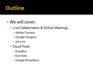 The document discusses accessing Blackboard through mobile applications and browsers. It describes the Blackboard Mobile app which allows students and faculty to access course content, and requires an annual subscription. The app allows viewing documents, announcements, discussions, and pushing notifications. Mobile exams created in Blackboard can be taken through the app. The document also discusses online assessment and polling tools, QuizStar and PollEverywhere, and provides instructions for creating quizzes and polls through these sites. It encourages discussion of mobile tools used in classrooms and additional resources.
