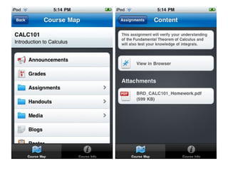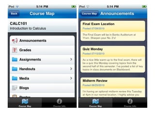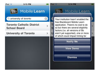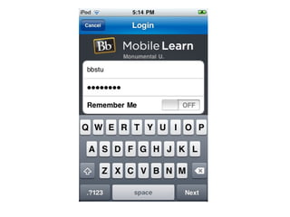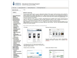 The document discusses mobile learning (m-learning) at the University of Toronto Scarborough, outlining its opportunities and challenges, as well as the integration of mobile technology in academic services. It highlights various mobile devices and applications, the need for effective user support, and the evolution of web content for mobile platforms. The document also reviews specific mobile applications and resources available for students, such as campus navigation and library services.