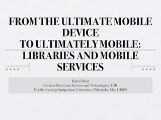 This document discusses how libraries can better serve mobile users. It notes that most students now carry powerful mobile devices but libraries are not fully taking advantage of this. Typical library mobile services include lending materials, distance education support, and wireless access. However, "Ask a Librarian" services are underused as students must be on the library website to use them. The document suggests libraries should provide content and services that are accessible via mobile devices. By 2011, more people will access the internet by mobile phone than desktop, so libraries need to respond by developing smartphone apps, podcasts, and mobile-friendly content and services.