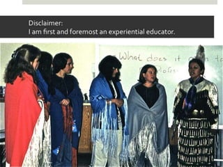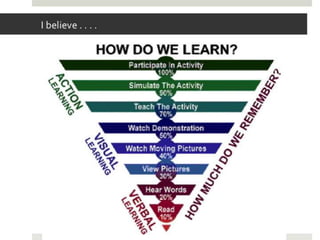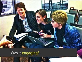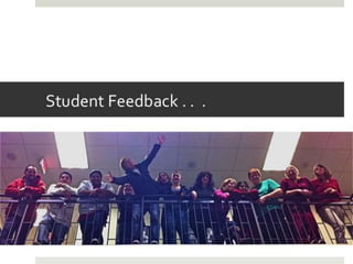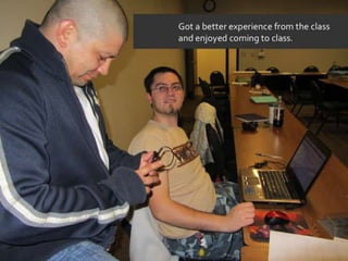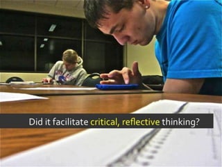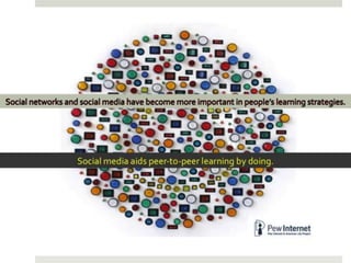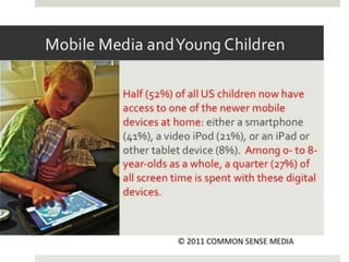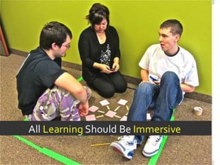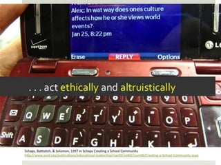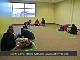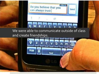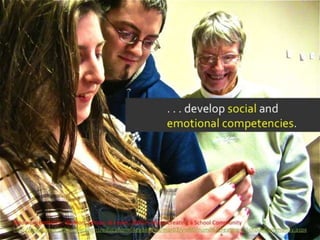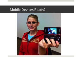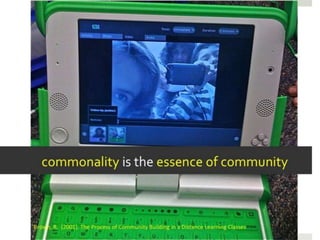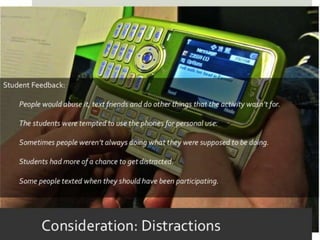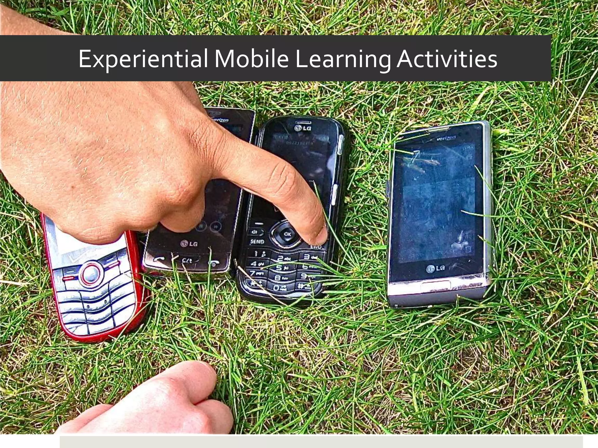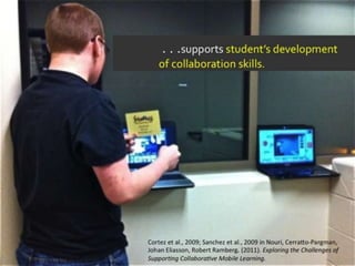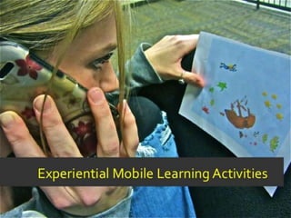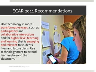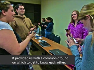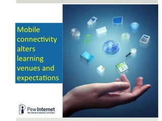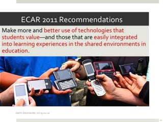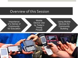 This document discusses experiential mobile learning activities and collaborative learning experiences. It finds that students learn best in environments with a strong sense of community. However, most schools score mediocre on measuring students' sense of community, and low-income and minority students often report even less community. The document also discusses how commonality and responsibility are important for building community in virtual learning environments. Finally, it provides an overview of mobile device ownership rates and findings from a student study that show students recognize academic benefits of technology but have uneven views of how schools integrate it.