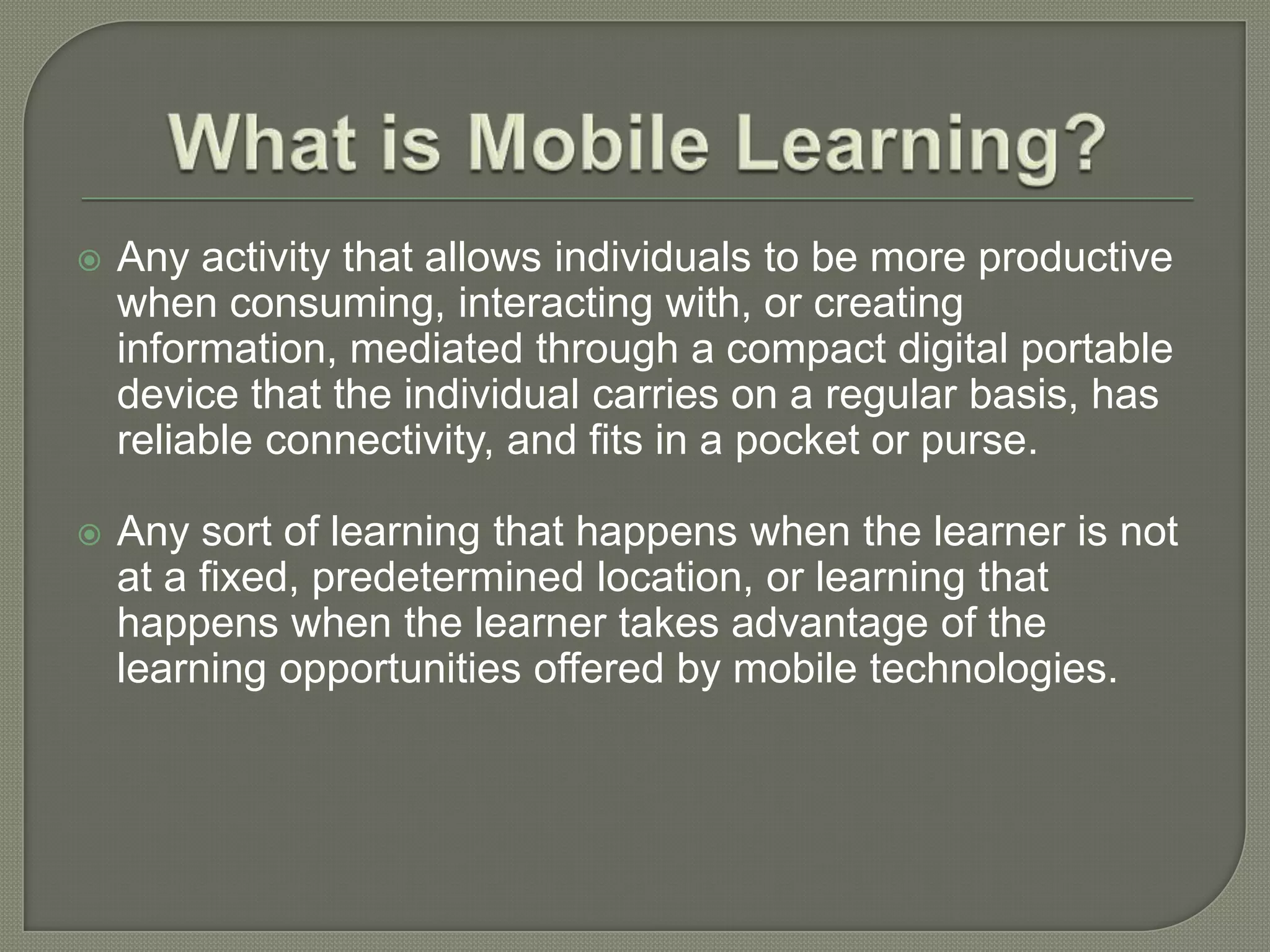 Mobile learning involves using portable devices like smartphones, tablets, and laptops to access educational content anywhere. It benefits students by allowing more flexible, personalized learning and greater interaction between online students. Teachers must adapt to using new technologies and managing devices in the classroom. While mobile learning provides opportunities, challenges include the costs of devices and technical support as well as monitoring student usage. Overall, mobile learning complements online education by making learning even more accessible for non-traditional students.