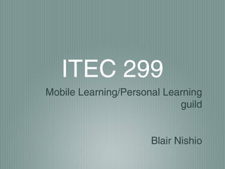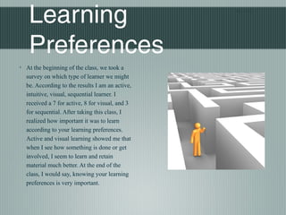 This document discusses the author's experience using various mobile technologies for learning. It describes how the author learned they are an active, visual, and sequential learner. The author explored using an iPod Touch with flashcards, an iPad and its apps, and Twitter for microblogging. The author found the iPod most effective currently but believes tablets will be even more useful in the future for their learning preferences.