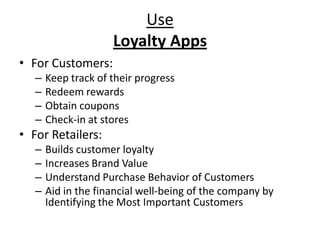 Mobile loyalty programs have advantages for both customers and retailers. For customers, mobile loyalty apps allow them to track rewards progress, redeem rewards, get coupons, and check-in at stores. For retailers, mobile loyalty programs build customer loyalty, increase brand value, understand customer purchase behavior, and aid financial well-being by identifying important customers. However, there are still needs around strengthening IT infrastructure in Indian retail, improving customer authentication methods, and creating simpler interfaces for mobile loyalty programs. Addressing these gaps could help bridge the gap between customer satisfaction and loyalty.