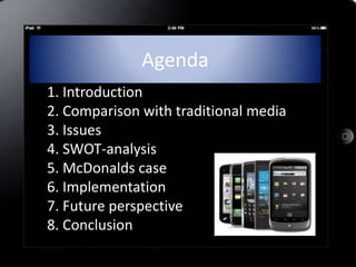 This document discusses mobile marketing and provides an overview of the topic. It begins with definitions of mobile marketing and stakeholders. It then covers comparisons with traditional media, issues in mobile marketing from 2005-2012 including privacy and aligning partners. A SWOT analysis identifies strengths, weaknesses, opportunities and threats. Implementation details are discussed including platforms and a 7 step process. The future of mobile marketing and how it can add value to businesses is addressed before concluding.