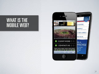 The document discusses the importance of mobile optimization for websites. It notes that the mobile web is becoming the primary means of global communication and that mobile-optimized sites are specially designed for mobile browsing. Poor mobile performance can deter business, while optimizing for mobile increases business. It emphasizes that mobile traffic is growing exponentially and will soon surpass desktop. The document advocates for complete customization, flawless functionality, and flexibility in mobile site design to provide the best customer experience and keep up with changing markets.