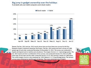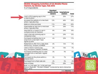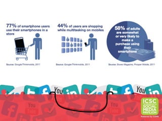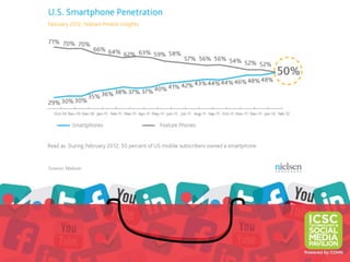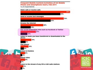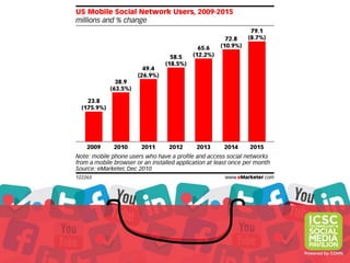 Mobile usage is growing rapidly, with 50% of web traffic coming from mobile devices by 2013 and over 488 million Facebook users accessing the platform mobile. This growth means websites must adapt to be accessible on mobile, through responsive design and leveraging new technologies like SMS/text messaging, mobile email, and HTML5. Resources for learning more about mobile marketing include specific websites and following the #mobile hashtag on Twitter.