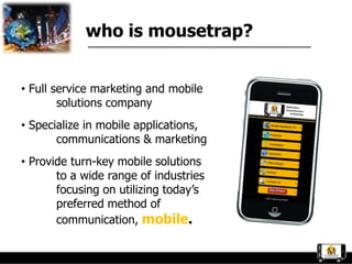 The document provides information about Mousetrap Mobile, a full service marketing and mobile solutions company. It discusses their services such as mobile applications, communications, and turn-key mobile solutions. Examples of solutions discussed include mobile apps, text communication services, text marketing campaigns, and education mobile programs. Case studies are presented showing successful implementations of their services for clients.