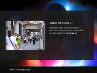 Mobile marketing involves communicating with customers through portable devices wherever they are. Projections estimate 6 billion iOS app downloads and 8 billion Android app downloads in 2012. Currently 52% of top US brands have mobile-friendly websites. When developing a mobile strategy, companies should consider where their users are located, what their users need, what devices their users have, and what existing content can be adapted. Apps have advantages like frequent use and access to device features, while mobile websites are better for search optimization and universal access. Measuring mobile marketing efforts includes tracking mobile interactions, conversions, and branding metrics.