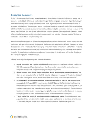 This report analyzes how tablets, smartphones and other connected devices are changing digital media consumption habits in the US. Key findings include: