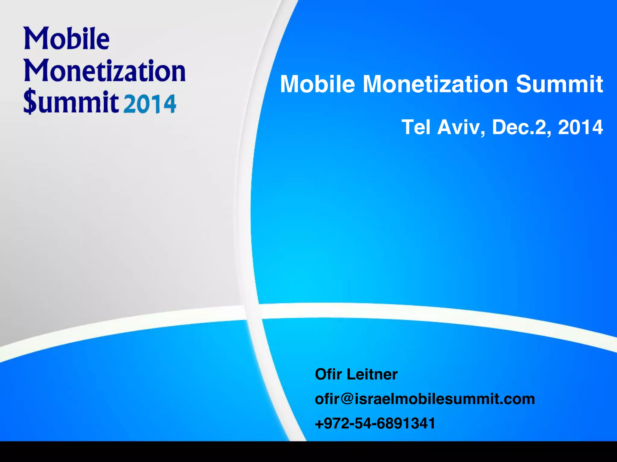 The Mobile Monetization Summit in Tel Aviv on December 2, 2014, focuses on monetization solutions for mobile apps and games, featuring keynotes, panels, and a live startup competition. Attendees include app developers, monetization providers, and industry leaders, with tracks covering mobile advertising, in-app purchases, and user acquisition. Previous summits have attracted significant attendance and sponsorship from major companies like Facebook and Google, highlighting Israel's thriving mobile startup ecosystem.