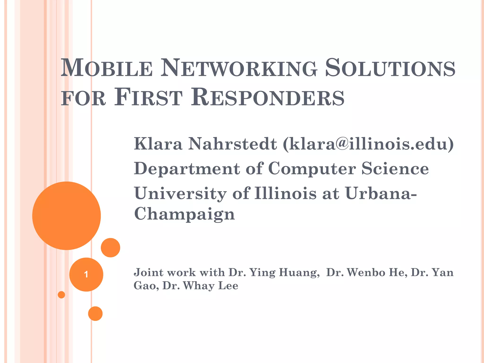 This document describes research on using mobile relays to improve connectivity for first responders. It discusses: