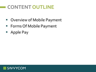 This document outlines mobile payment, detailing its definition as a fund transfer for goods or services via mobile devices. It covers various forms of mobile payment, such as SMS, QR code, NFC, and in-app purchases, highlighting advantages for both consumers and shop owners. Additionally, it provides a brief overview of Apple Pay, including its security features and market acceptance.