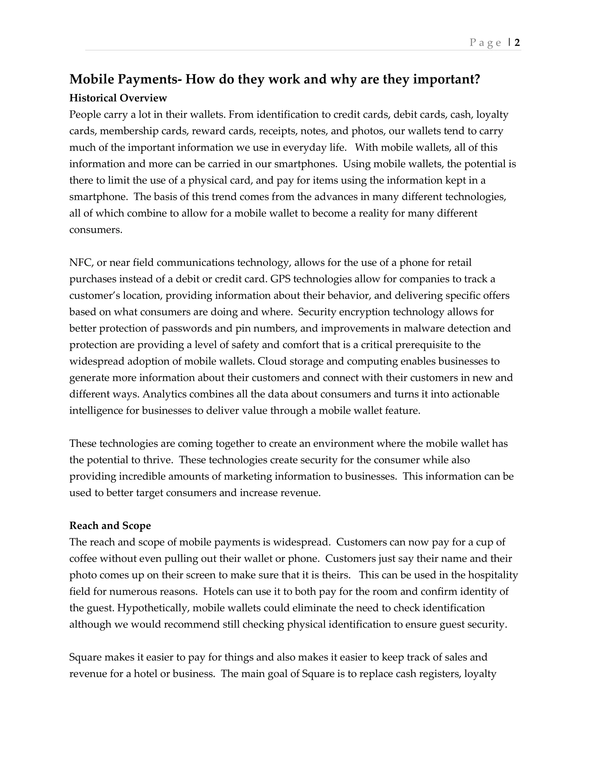 This document discusses mobile payment systems and their importance. It provides examples of how mobile payment apps like Square work and the technologies that enable them like NFC, GPS, security encryption, and cloud storage. Two case studies are examined: the Blue Glass Cafe implemented the LevelUp app, seeing increased speeds and valuable customer analytics. Starbucks partnered with Square but customer reviews of the experience are mixed as it's not always faster than a credit card. The document advocates that mobile payments should make transactions easier for customers.