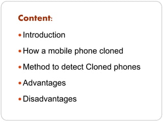 This document discusses mobile phone cloning, including how it works by capturing and cloning a phone's SIM/IMEI pair using scanning devices, and then reprogramming the phone's microchips. It notes that cloned phones can be detected through methods like duplicate detection, velocity traps, radio frequency monitoring, checking PIN codes, and usage profiling. While cloned phones can benefit users if their original phone is lost or damaged, the document also explains cloning has disadvantages like enabling illegal money transfers and use by terrorists for criminal activities.